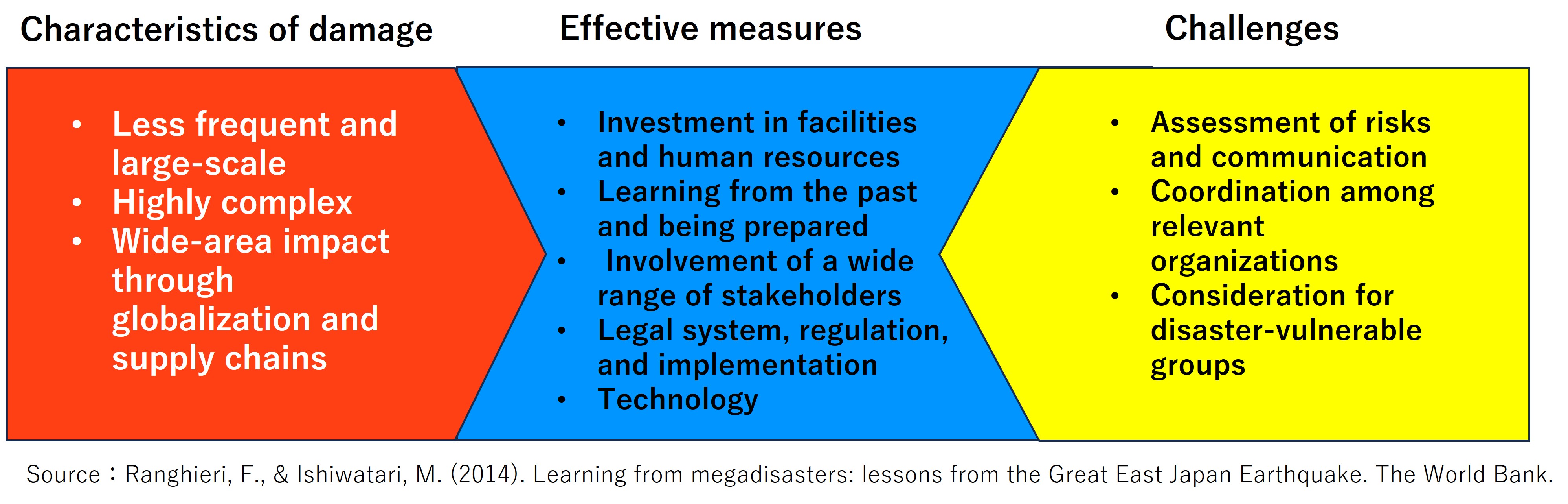The World Bank report, Learning from Megadisasters: Lessons from the Great East Japan Earthquake, which I led in preparing, organizes the characteristics of the damage caused by the disaster, effective measures, and future challenges. The report assesses that although the damage caused by the earthquake was enormous, the disaster management system that Japan has accumulated over the decades had performed a certain function, and to some extent contained the spread of damage.
