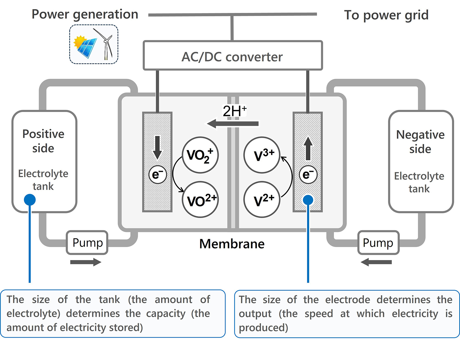 Generally, the active materials proceeding the redox reactions is vanadium, the liquid is an aqueous solution of sulfuric acid, and the electrodes are carbon porous sheets. As the oxidation state of vanadium changes at the carbon electrodes, charges are transferred at the electrodes. This charge transfer generates an electric current, which is then converted by an AC/DC converter and transmitted to power networks.